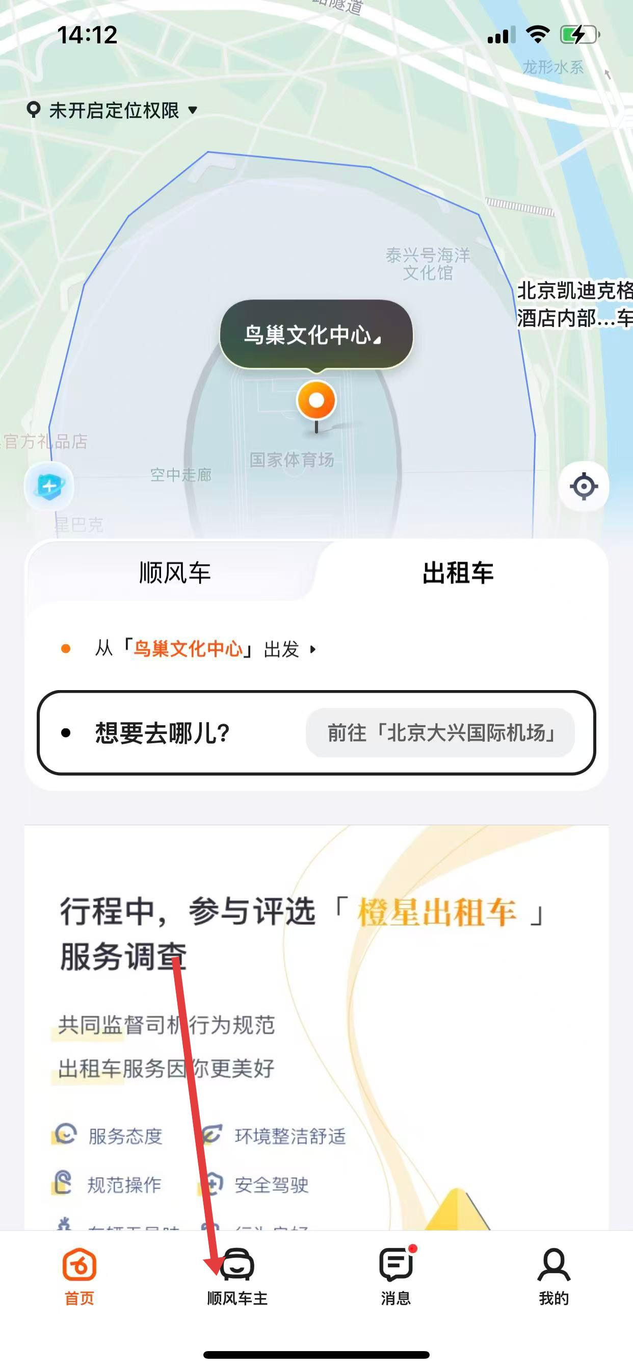 1、打开嘀嗒出行APP,进入首页,点击底部菜单栏中的顺风车主选项;
