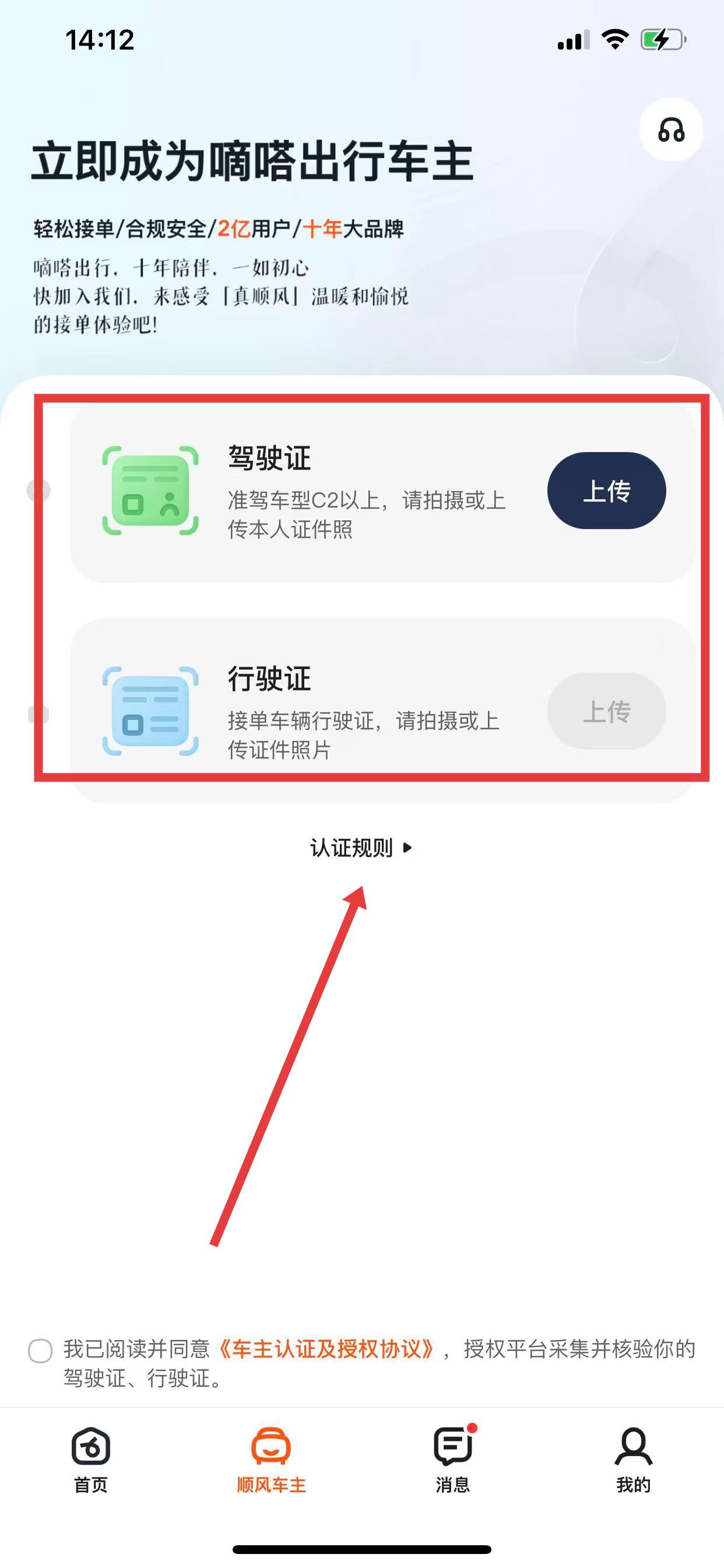 2、准备好驾驶证和行驶证,点击驾驶证右侧的上传按钮,点击行驶证右侧的上传按钮,拍摄或上传接单车辆的行驶证照片;