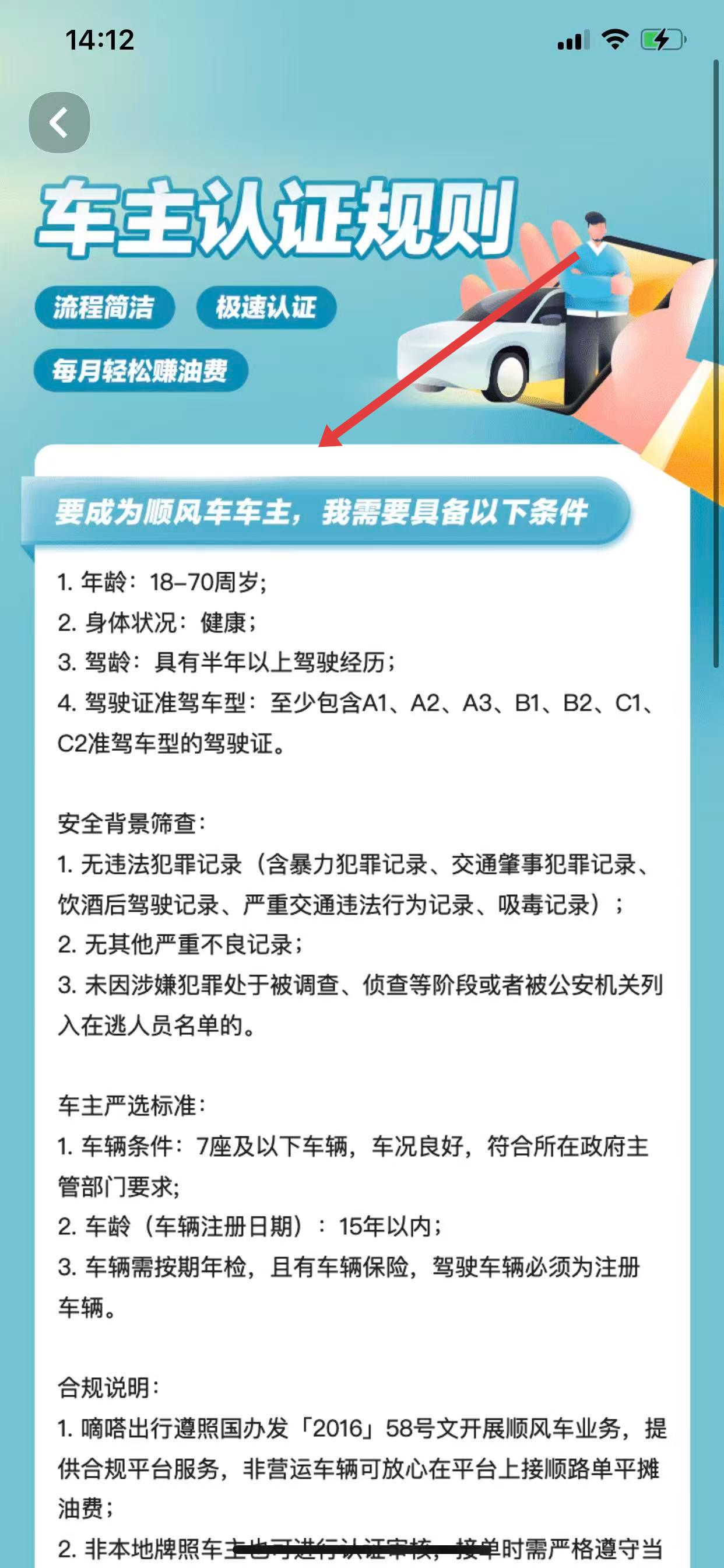 3、仔细阅读成为顺风车车主需要具备的条件,包括年龄、身体状况、驾龄、驾驶证准驾车型。