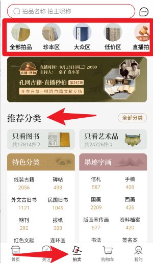 4、在“拍卖”页面可选择全部拍品、珍本区、大众区、低价区及直播拍等板块,并可按推荐分类筛选浏览;