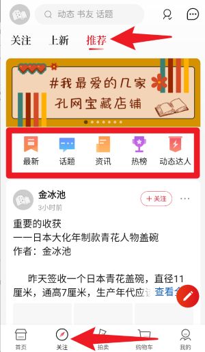 3、进入“关注”页面,可在推荐栏目下浏览最新、话题、资讯、热榜及动态达人等内容,获取收藏与交易信息;