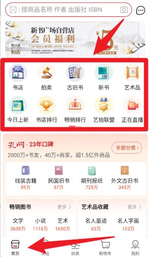 2、在首页可通过顶部功能区进入书店、拍卖、古旧书、新书、艺术品等分类,浏览并选购心仪商品;