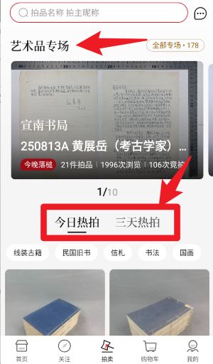 5、继续下滑进入艺术品专场,可根据需要切换“今日热拍”或“三天热拍”查看热门拍品,并可按书法、信札、国画等分类精准筛选,方便快速找到感兴趣的竞拍作品