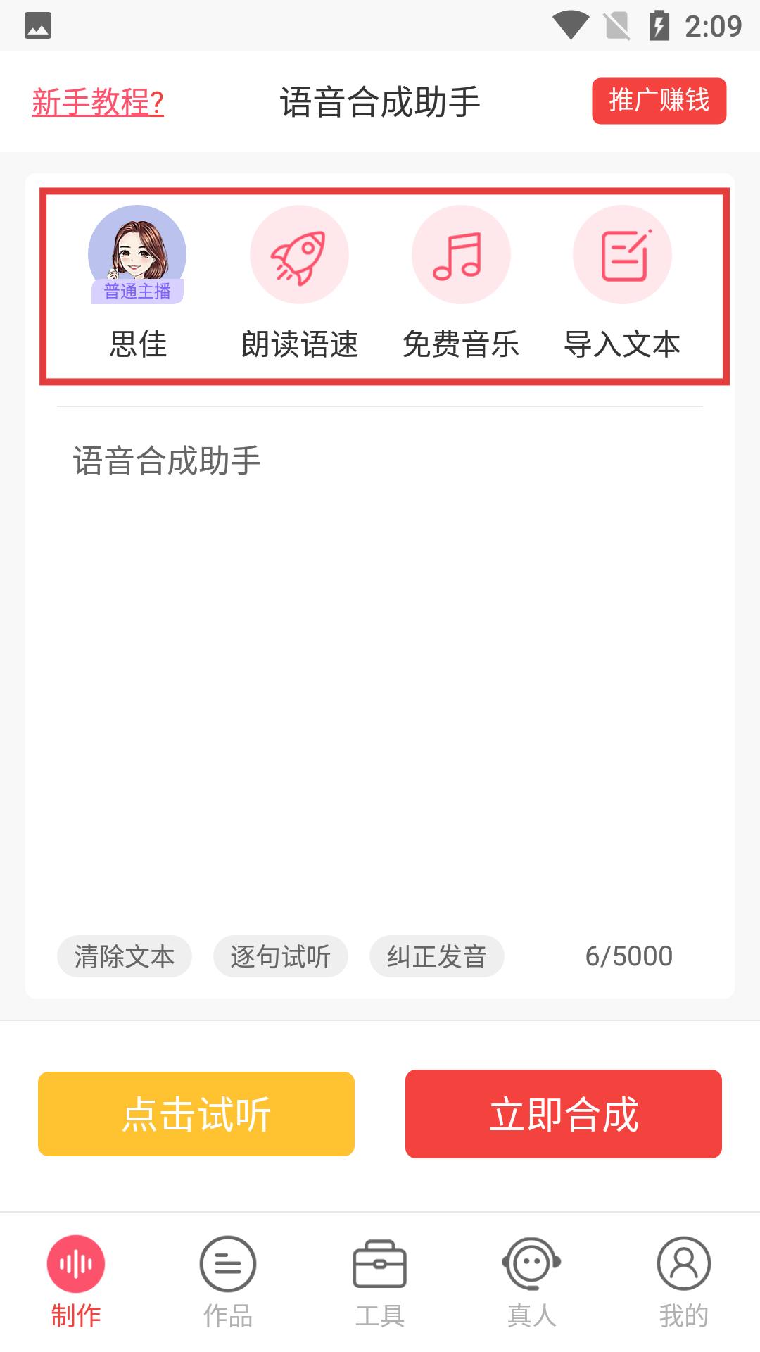 2、在制作页面,可选主播、调语速、加音乐或导入文本,为语音合成做准备,下方还可以进行试听;
