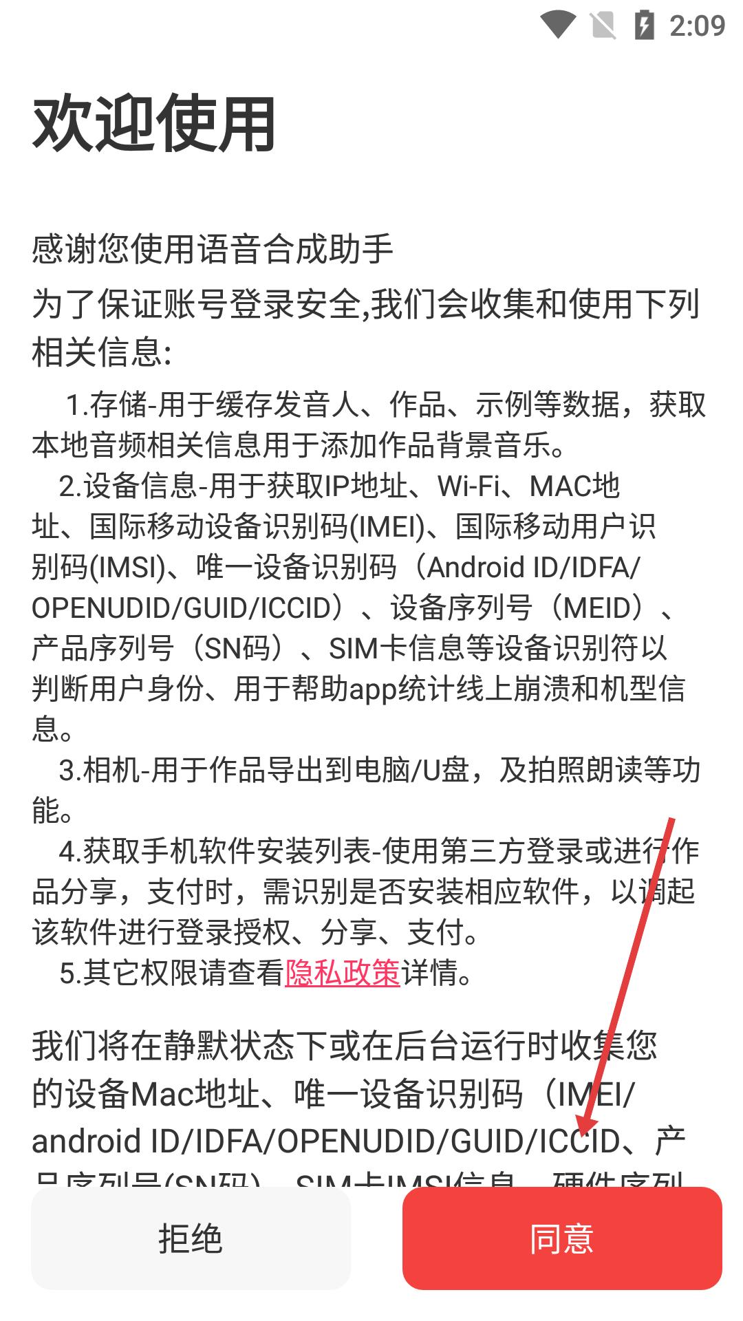 1、打开语音合成助手,阅读权限说明后点击同意,进入应用,开启语音合成创作之旅;