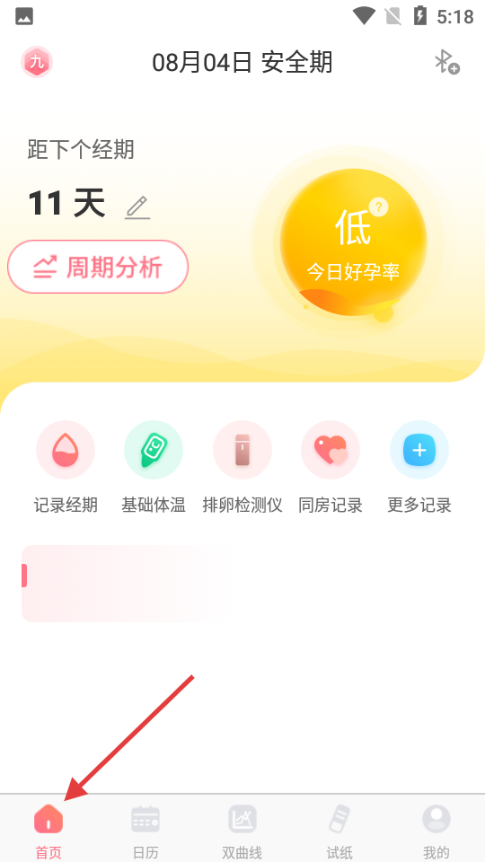 1、首页标注8月4日为安全期,距下次经期11天,提供经期记录、周期分析等多样功能;