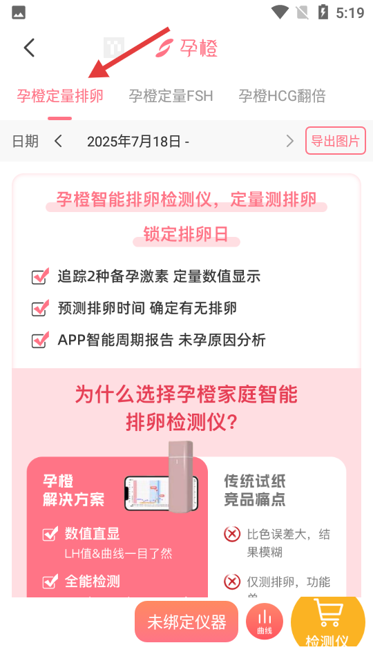 3、孕橙产品专属页,聚焦智能排卵检测仪,强调定量测排卵、追踪激素及生成智能报告等核心优势。