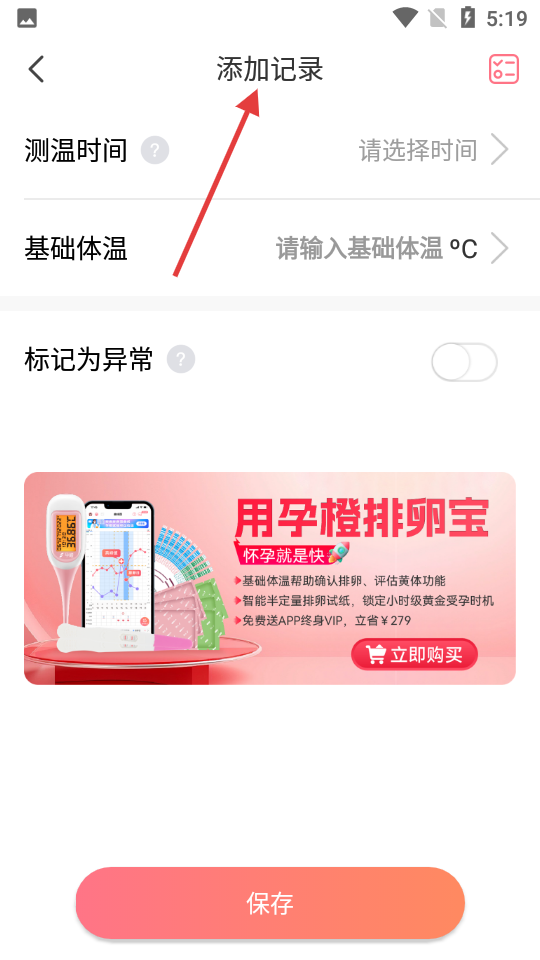 2、添加记录界面,可精准录入基础体温等信息,设有异常标记选项,底部推荐孕橙排卵宝相关产品;