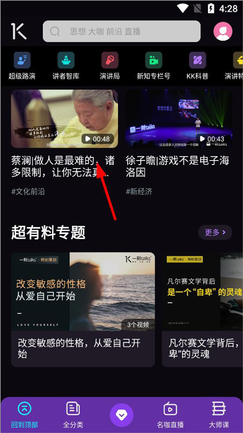 1、打开一刻Talks app,登录进入首页,用户可在发现页面查看超级路演、讲者智库、演讲局、KK科普等栏目,点击大师课;