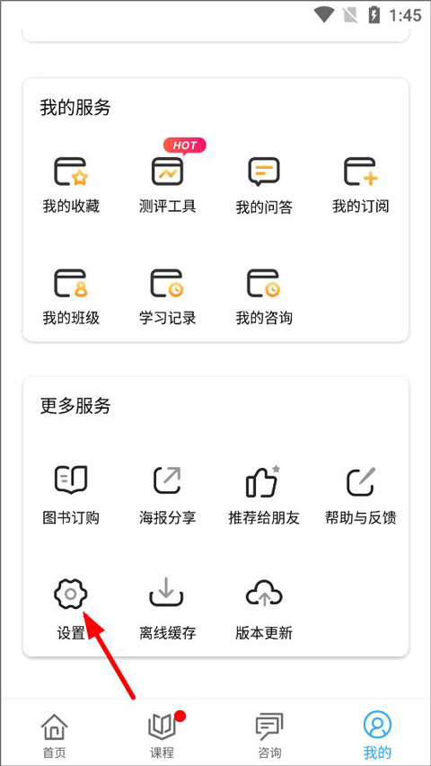 2、打开我的页面,用户可查看积分、学习时长、班级排名、我的服务等,下拉找到设置;