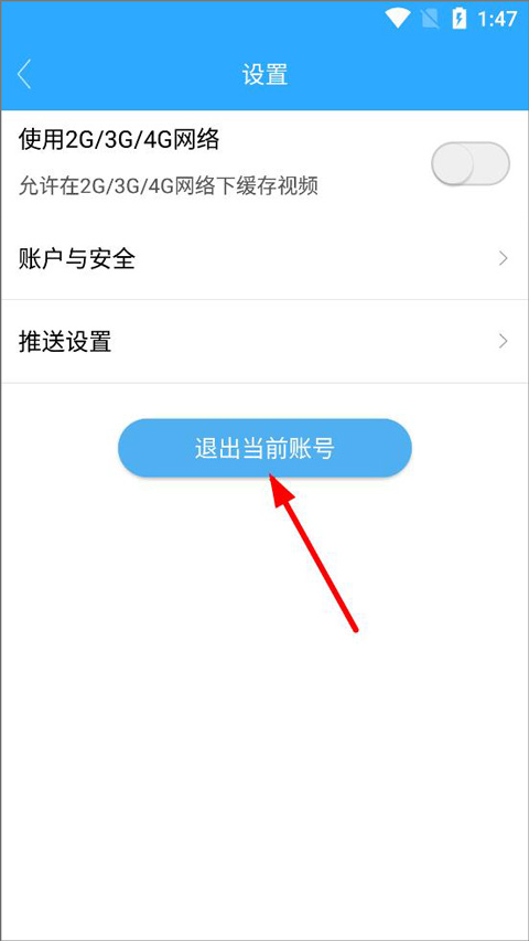 3、进入设置页面,用户可设置允许在2G/3G/4G网络下缓存视频、查看账户与安全、推送设置等,点击退出当前账号,再次重新登录即可切换账号。