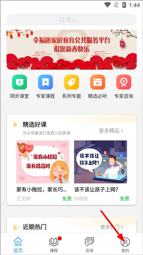1、打开幸福路家庭教育平台app,进入首页,用户可在首页查看同步课堂、专家课程、系列专题、近期热门、精选好课等,点击我的;