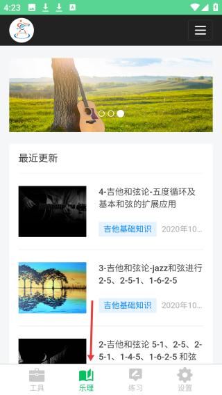 2、点击乐理界面,呈现最近更新板块,展示吉他和弦论等基础知识文章,助力乐理学习;