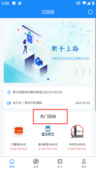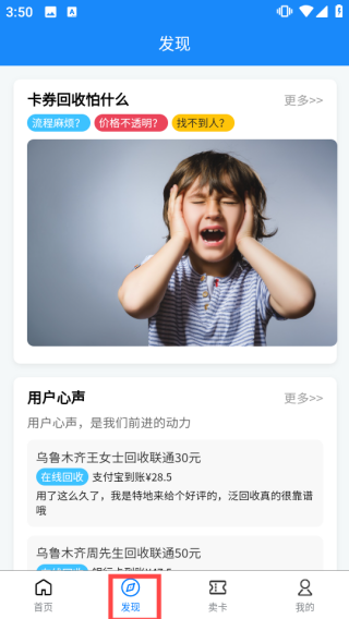 2、点击底部【发现】按钮,可查看卡券回收常见问题及用户心声等内容;