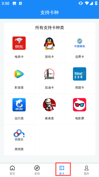 3、点击底部【卖卡】按钮,进入页面可看到支持回收的卡种,如电商卡、游戏卡、话费卡等。