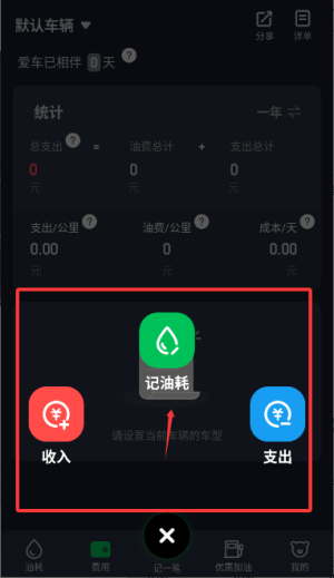 2、完成车型设置后,通过记一笔功能可录入油耗相关收支数据;
