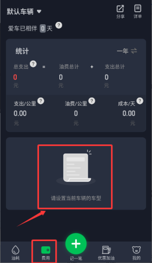 1、进入小熊油耗主页面,点击费用选项可设置当前车辆具体型号;