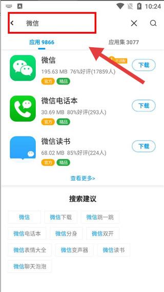 1、打开应用商店,进入推荐页面,点击顶部搜索栏,输入你要查找的应用名称并执行搜索操作,进入微信应用搜索结果页面。