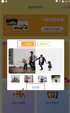 2、然后选择人像抠图,点击去抠图,再选择一张图片;