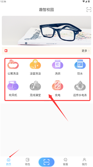 2、返回应用首页,在趣智校园区域找到洗衣、饮水等服务功能入口;