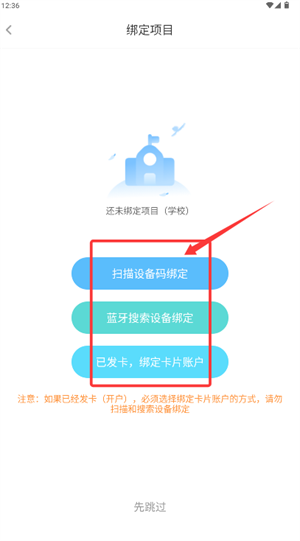1、启动应用进入绑定项目页面,可选择扫码或蓝牙等方式连接设备;