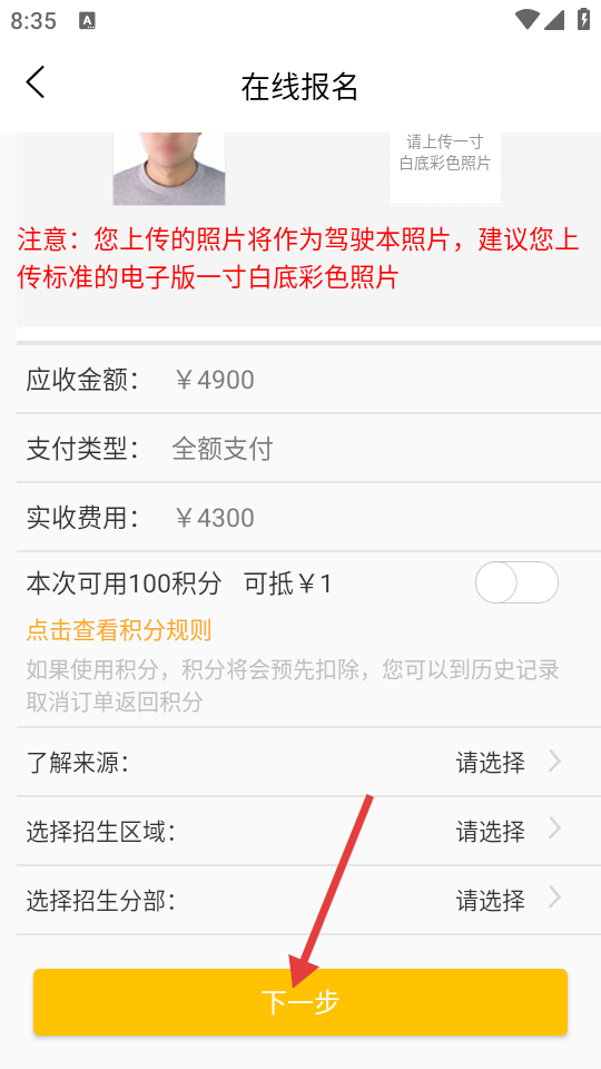4、在在线报名页面,按要求填写信息,完成后点击【下一步】按钮,继续后续报名流程。