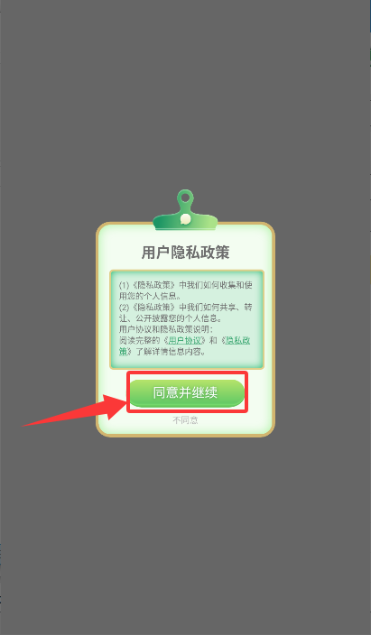 1、首次启动应用,请在用户隐私政策页面点击同意并继续;