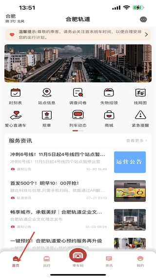 1、首页,有时刻表、站点信息等功能,还有服务资讯,可看运营公告等,助乘客获取轨道服务与动态;
