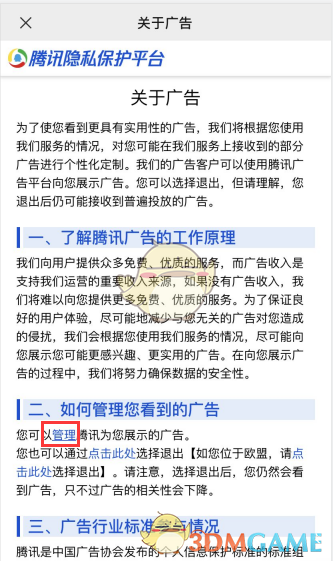 5、进入【关于广告】后,点击页面第二项第一行的蓝色字【管理】