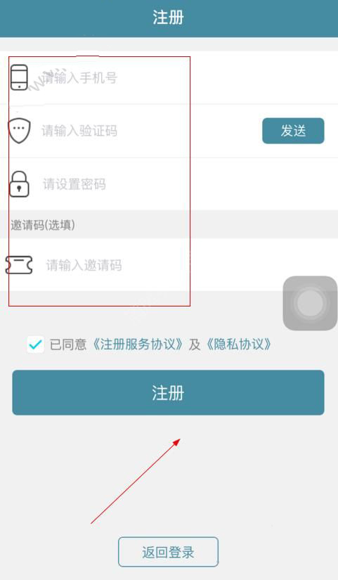 2、在注册页面中输入手机号、手机短信验证码、密码、如果有邀请码的输入邀请码,然后点击注册即可。