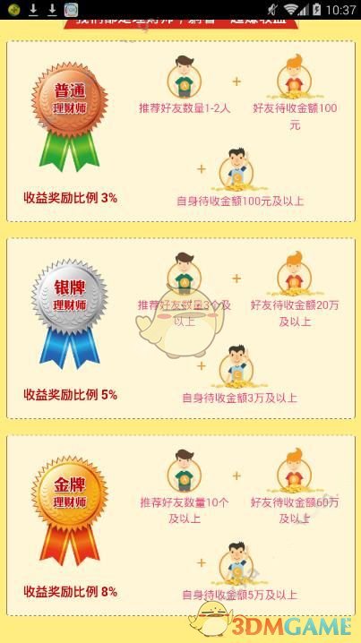 普通理财师收益奖励比为3%;银牌理财师收益奖励比为5% ;金牌理财师收益奖励比为8%。