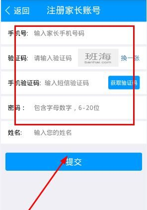2、在注册家长界面,输入手机号,验证码,密码,姓名,点击提交按钮就可以注册的哟~