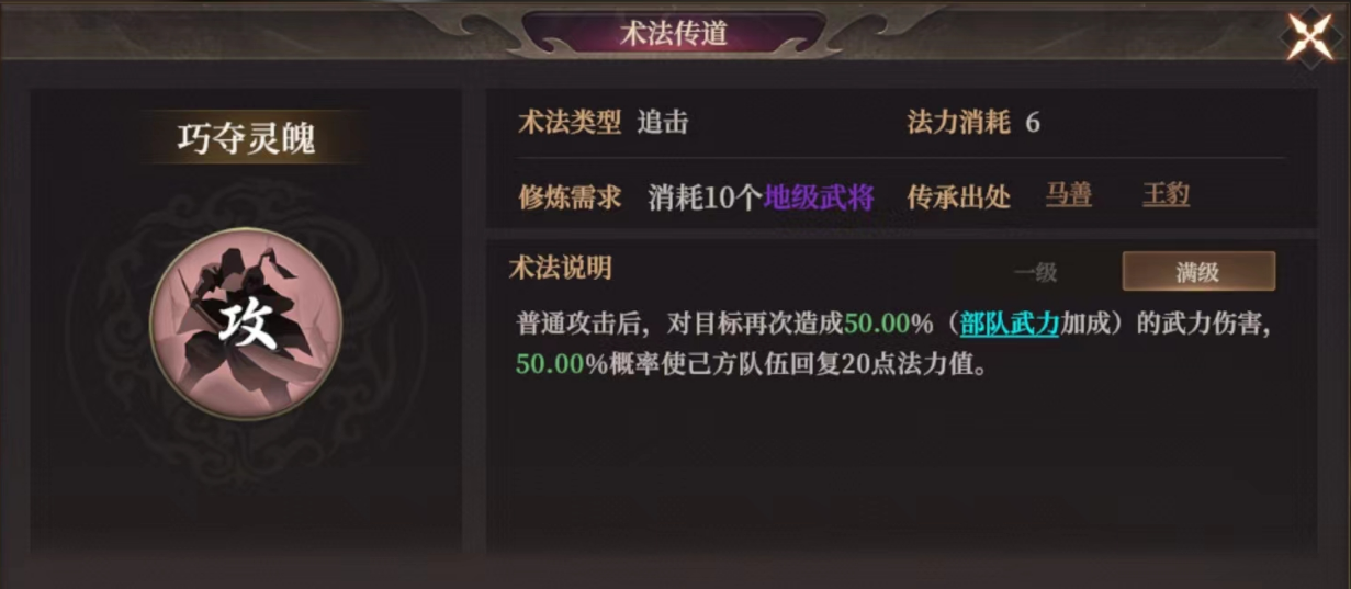 看似能挂神算buff,而且提升武力、智谋和一速,但实际上应用面有限。根据阵容中其他术法的特性决定是否携带。