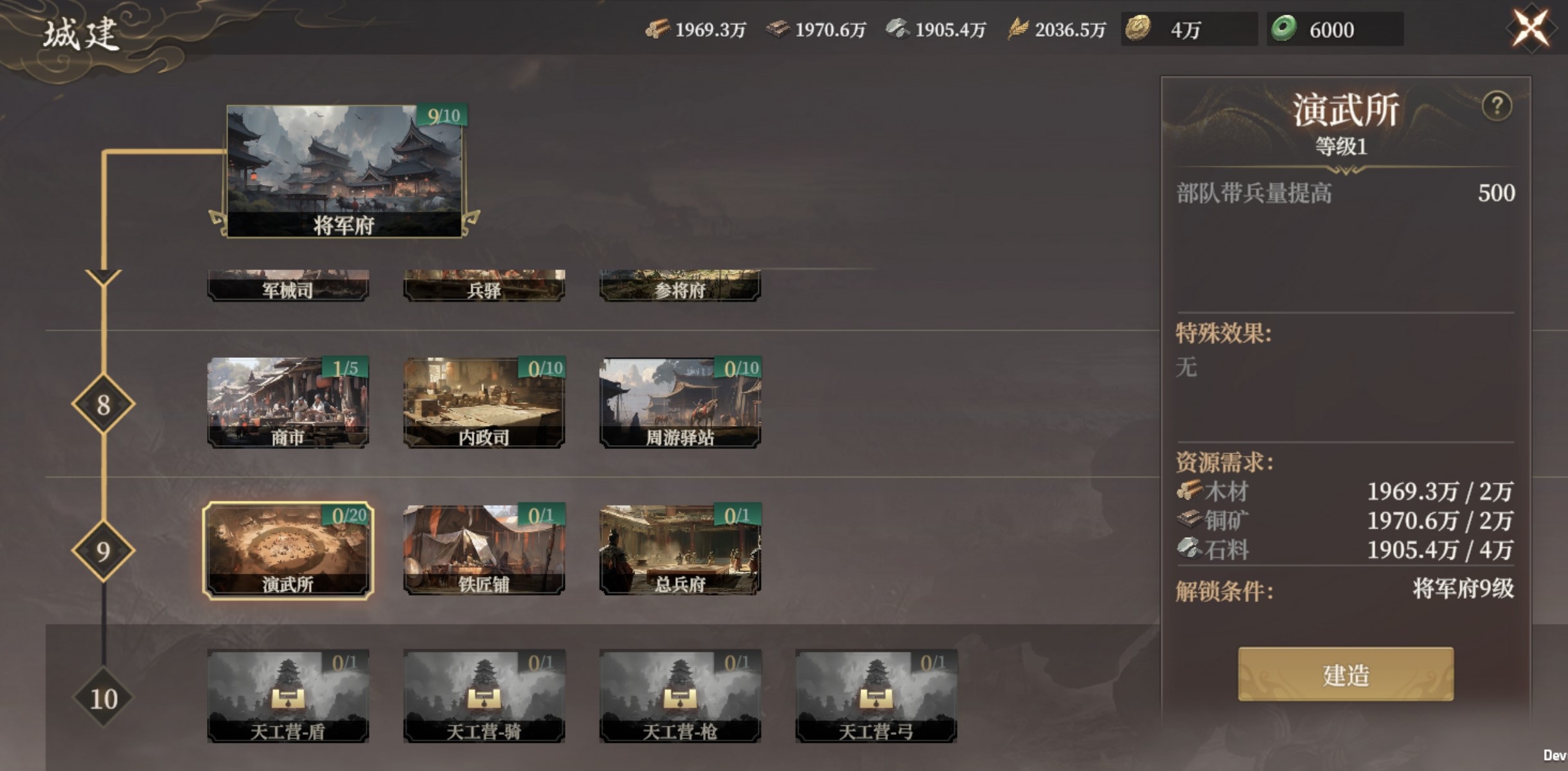 将军府升至9级是核心目标,它是解锁重要城建【演武所】的条件。