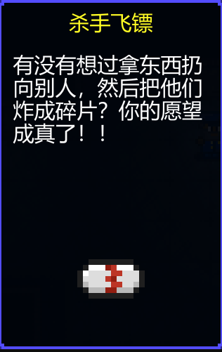 1、介绍:使用后获得一个30秒的buff,其间扔出去的任何投掷类物品都能把npc秒杀,除机器人杀手外,会造成100的伤害。