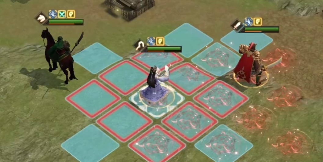 关羽-青龙突击:对前方3格范围内的所有地方造成近战兵刃伤害,同时自身向前突击相同距离