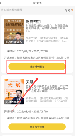 2、点击底部菜单栏的“线下课程”,选择您感兴趣的课程和合适的时间段,填写个人信息并提交申请。