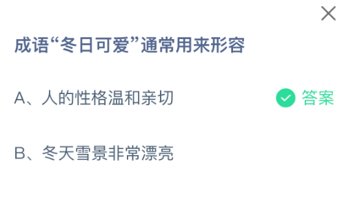 以上就是成语“冬日可爱”通常用来形容,支付宝蚂蚁庄园2025年10月2日答案最新,更多精彩内容,请点击关注3DM手游网更新!