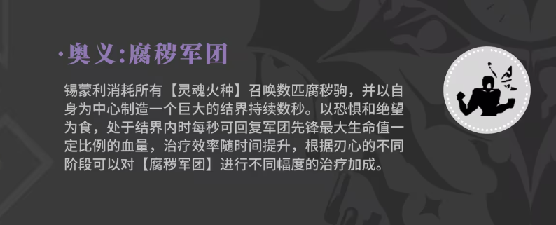 在锡蒙利大招上面,是需要消耗所有灵魂火种的,甚至会召唤出来很多的腐秽军团当中的灵体进行输出,并且这些军团里的成员,会在战斗的中心处制造一个巨大的结界,此时这个结界持续的时间比较长,在结界持续的时间之内,敌人都会受到一定的负面影响,而且如果是在这个结界范围之内还有其他队友的话,那么队友还会获得一定的增益,当然首要是给军团先锋带来一定的生命值提升,此时带来的恢复血量数值也会得到提升,在治疗效率提升的同时,还可以根据韧性的不同阶段对锡蒙利召唤来的军团成员,进行不同幅度的治疗加成。