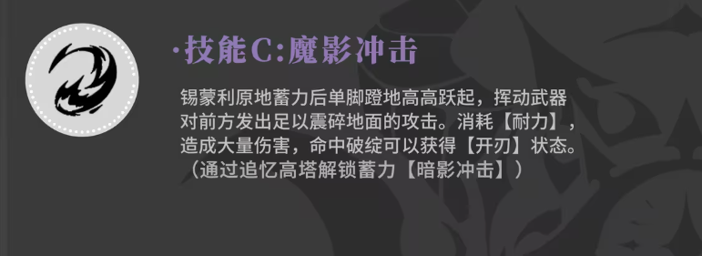 锡蒙利的技能三叫做魔影冲击,使用这个技能之后锡蒙利在魔力数值虽然需要在原地蓄力一段时间,但是后期挥动自己的武器,对前方造成很大能力的输出之后,这个攻击效果当中还会出现一个震碎地面的特效,在这个特效周围,敌人也会受到伤害,只是消耗耐力还可以带来大量的伤害,还可以命中敌人的破绽带来弱点伤害,其实如果是命中破绽的话,得到敌人效果就是开刃的效果。