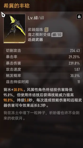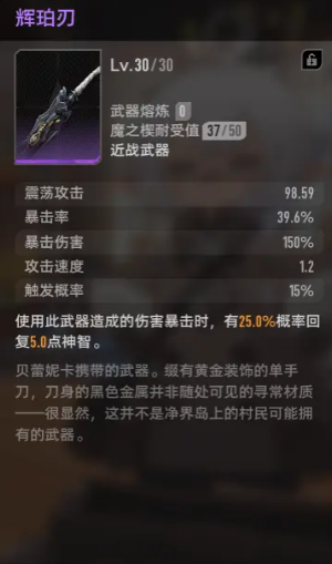 那从实力这一方面来看,也可以对比一下辉珀刃,这一个武器获取真的是一点门槛都没有,新手在走完流程之后就可以获取。后期如果觉得不够用,也可以到卡池里面抽卡获取。对于玩家而言,很适合用来开荒,在暴击的时候就可以有机会提升神智。对于一开始比较缺能量释放技能的新手来说,这就如同是救命稻草,而且这武器一点都不会挑人,不管是哪一个角色都可以用来过渡,真的还是很舒服的。