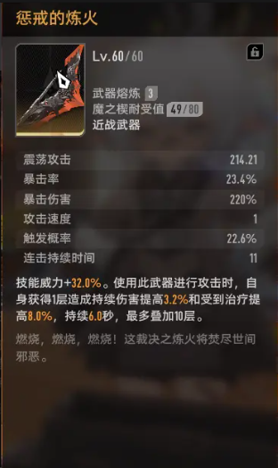 也有一些玩家认为可以选择使用惩戒的炼火过渡了。这一个武器只需要通过刷本获得材料就能够铸造,获取的难度真的并不是很高。如果是对比春玦戟。那这一个武器主要的优点就在于可以支撑面板。被动能力就可以获得20%~40%的威力加成,在一开始用来堆属性还是很不错的。不过还有一点需要注意,这武器的被动加成其实是有限制,一般只会对自己生效,并不会加到其他的武器上面。好在在第2次测试的过程中,近战武器本身就只是一般用来作用于过渡,那还是很不错的,可以直接拿到毕业武器,然后再重新的更换。