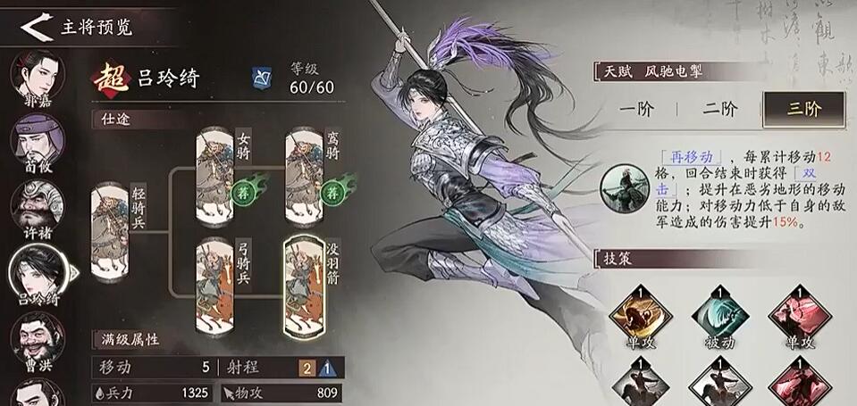 想把吕玲绮玩出飞一般的感觉,最关键的并不是堆高攻击,而是把她的步数当成核心资源去经营。普攻后触发3格再移动,立刻拉开距离,等回合结束的双击自动追击,对面往往还没反应过来就被秒掉了。而且要注意原一格算1点移动力,山地算1.5点,水域算2点,所以提前在战前布阵里把吕玲绮放在右下或左上角的平原边缘,开局就能天然多蹭半格距离,这一丁点优势在高端局里常常决定先手权。