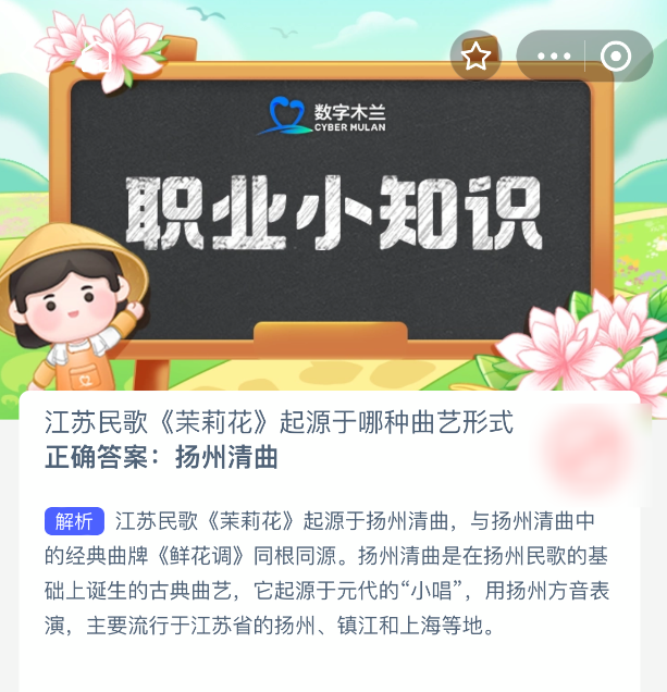 江苏民歌《茉莉花》起源于哪种曲艺形式?【蚂蚁新村每日一题】2025年10月10日题目已发布!坚持答题,积累木兰币,即可加速小镇建设。答对本题,立即可享“产速+3/时”的加速奖励!今天正确答案是【扬州清曲】。江苏民歌《茉莉花》起源于扬州清曲,与扬州清曲中的经典曲牌《鲜花调》同根同源。