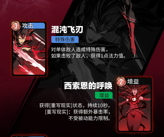她的战技“混沌飞刃”会对单体敌人造成特殊伤害,如果成功击败敌人会获得1点法力值,大家实战中可以尽可能用此招来击杀敌人进行收割,她的战技“西索恩的呼唤”会获得持续10秒的重写现实状态,重写现实能帮助获得额外的暴击率,无视被动技的限制。