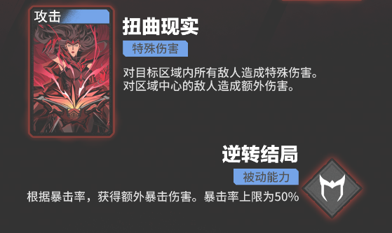 大家在使用伤害技之前,可以先用此招来进行增益,提升暴击率并忽略掉限制,她的终结技“扭曲现实”会对目标区域内的所有敌人都造成特殊伤害,对位于区域中心的人将造成额外伤害。