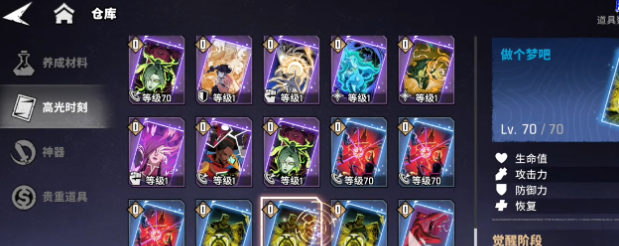 神器处理:前期无需追求金色完美神器,蓝色或紫色神器已足够过渡。输出角色可携带“做个梦吧”,防御角色选择“暗中的光”,辅助角色推荐“织梦人”以加速回能。神器升至8级解锁两条词条即可,后期再逐步更换高阶神器。
