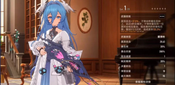 接着也可以看一下具体的属性,按照基础的状态举例说明震荡攻击20.63,攻击率为20%,暴击伤害是200%。有20%的触发几率,最大的弹药是90发,武器技能也是比较有特色的。震荡攻击伤害就可以增加37.5%,子弹打在目标的身上就会直接粘住,三秒之后就会直接爆炸。要是好几颗子弹全部黏附在同一个位置,那就会叠加伤害,并且还会有爆炸性的范围。越多则意味着所造成的恐怖伤害就更厉害,二次爆发才是真正的威力。