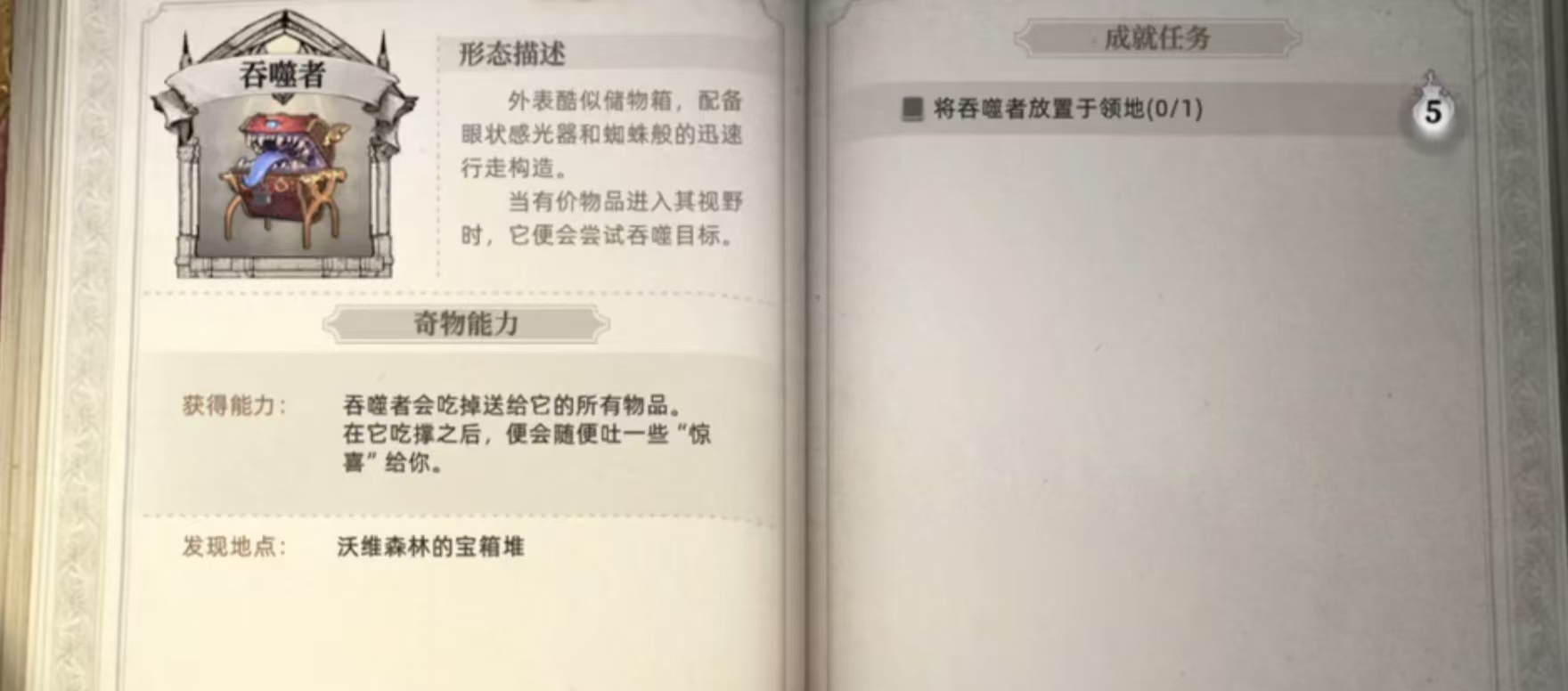 在荒原曙光中,吞噬者一个像宝物箱的贪吃鬼,它吐着舌头,有着蜘蛛一样的四足用来在地上行走。吞噬者的主要功能是处理多余装备和获取材料,类似于游戏中常见的装备分解台,玩家将不要的装备喂给它吃,它会吐出部分装备材料,运气好的时候能得到金色装备材料。