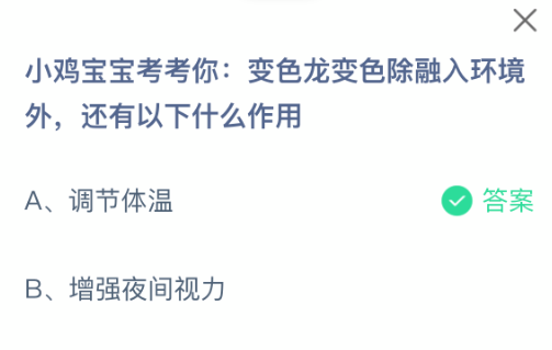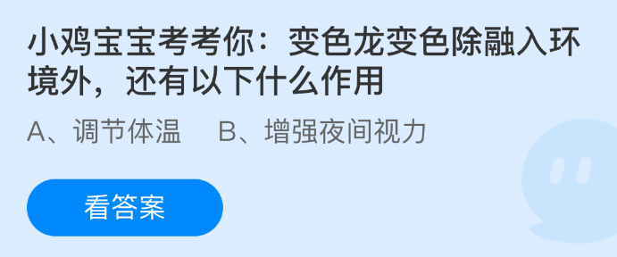 以上就是小鸡宝宝考考你:变色龙变色除融入环境外,还有以下什么作用,支付宝蚂蚁庄园2025年10月15日答案最新,更多精彩内容,请点击关注3DM手游网更新!